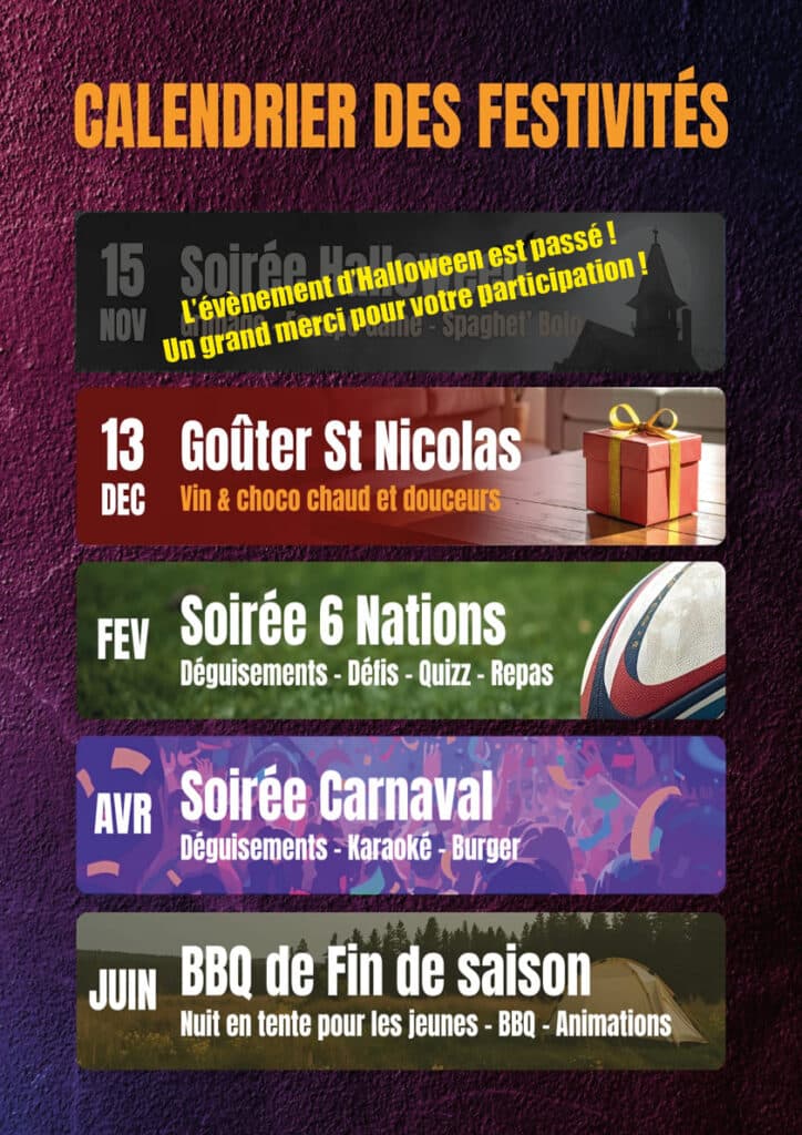 En raison de l’absence de calendrier définitif pour les matchs de compétition de 2026, les dates des événements suivants seront fixées ultérieurement:La soirée 6 Nations;La soirée Carnaval;Le Barbecue de fin de saison.